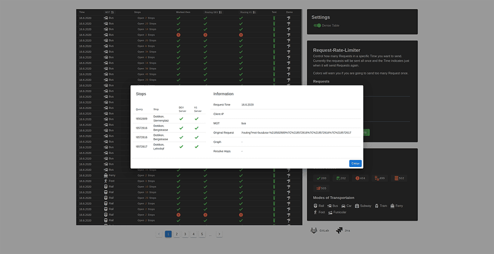 Wir haben ein einfaches, ansprechendes User Interface bereitgestellt, das alle Routing-Ergebnisse in einer Tabelle darstellt. Man kann durch Symbole sehen, ob die Anfrage zum Anfragezeitpunkt erfolgreich war oder nicht. Das Hilfreiche an diesem Tool ist, dass es die Möglichkeit gibt, die Anfragen erneut durch die Routing API zu jagen, um einen Vergleich zu schaffen. Alle Anfragen können eingesehen werden, wodurch man die Antwort der jeweiligen Anfrage sehen kann.